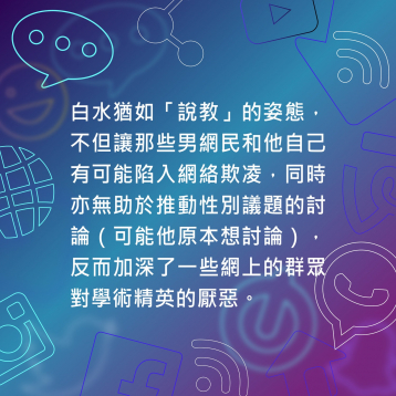 因此,在這些背景底下,白水猶如「說教」的姿態,不但讓那些男網民和自己有可能陷入網絡欺凌,同時亦無助於推動性別議題的討論(可能他原本想討論),反而加深了一些網上的群眾對學術精英的厭惡。