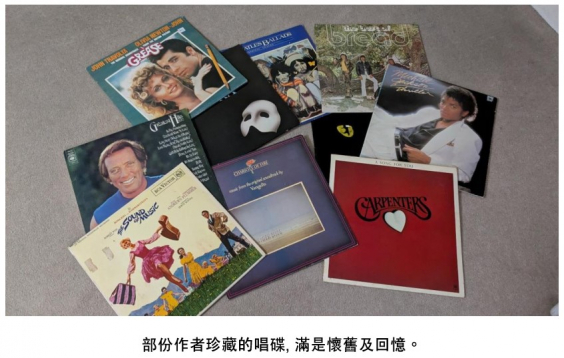 在英國的二手店(Charity shop)尋寶,總會找到一些被遺忘的經典:Bread、Carpenter、The Beatles、Elvis Presley、Andy William……還有音樂劇:Cat、Les Misérables、Phantom of the Opera...,只用一、兩英鎊的價錢,就能把那些可能比我「年紀」更大的黑膠帶回家,捧在手上的已不是一張唱碟,而是年代歲月的記錄及痕跡。