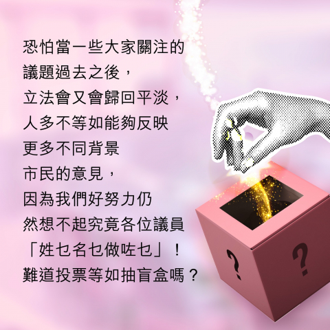 正所謂有得揀先至係老闆,但現時的情況似乎是「因為係老闆先至有得揀」。當與自己理念較為接近的人根本連參與的機會也沒有的時候,有幾多人會積極參與別人已經替你篩選好的所謂選舉呢?恐怕當一些大家關注的議題過去之後,立法會又會歸回平淡,人多不等如能夠反映更多不同背景市民的意見,因為我們好努力仍然想不起究竟各位議員「姓乜名乜做咗乜」!難道投票等如抽盲盒嗎?