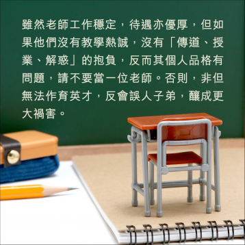 早在1200年前,韓愈在《師說》中提出,老師的職責為「傳道、授業、解惑」——傳授人生道理、講授學業知識、解答學生疑問,此理念至今仍然適用,社會對教師仍有高度期望。雖然老師工作穩定,待遇亦優厚,但如果他們沒有教學熱誠,沒有「傳道、授業、解惑」的抱負,反而其個人品格有問題,請不要當一位老師。否則,非但無法作育英才,反會誤人子弟,釀成更大禍害。