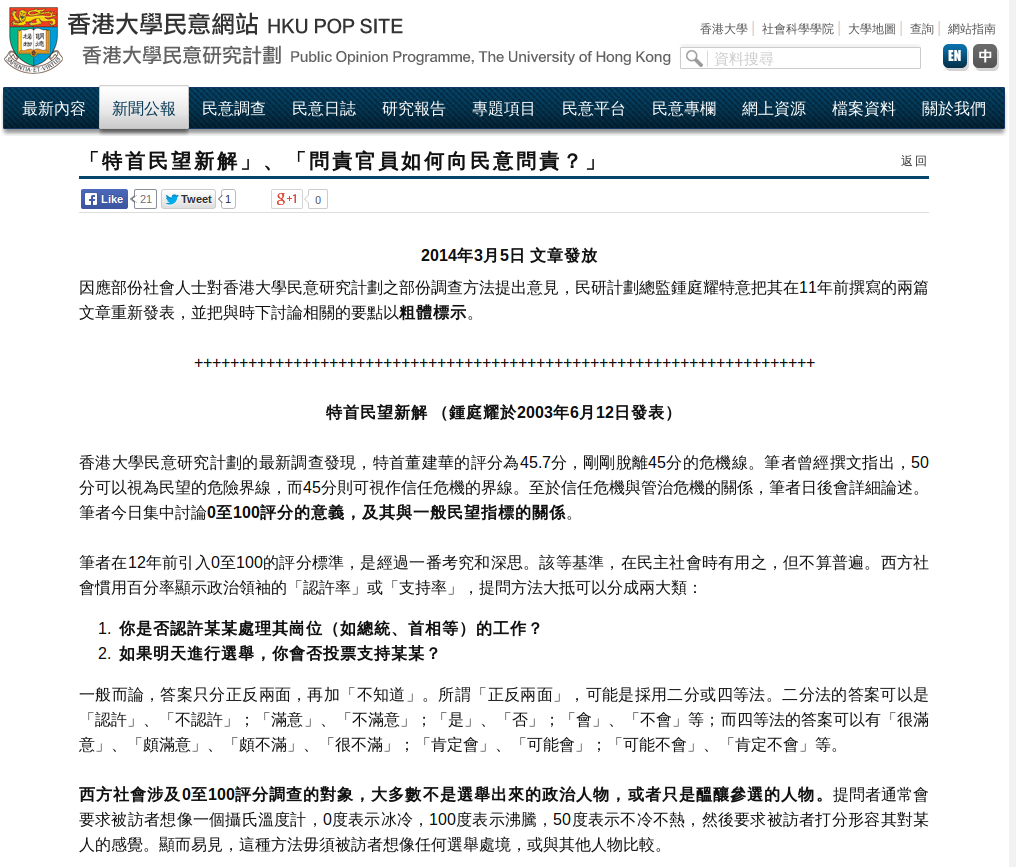 有一日你收到一份調查,關於你對班主任的評分,由0至10分,如果你答案是值5分,你的意思是「合格」還是只是「一半半」?這一條很簡單的問題,居然就是為香港近日政治上熱鬧討論的話題。香港大學鍾庭耀做特首民望調查,一直都是用0至100分讓受訪者評分,問的時候強調50分是代表「一半半」。 平日考試50分「合格」,為什麼要做問卷就會變成「一半半」?