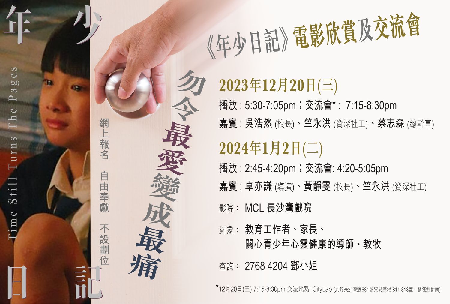 為關注兒童及青少年學業壓力、情緒及自殺等問題,明光社分別在12月及1月在MCL長沙灣戲院舉辦了兩場「《年少日記》電影欣賞及交流會」,希望能與關心兒童及青少年成長的家長、導師交流。