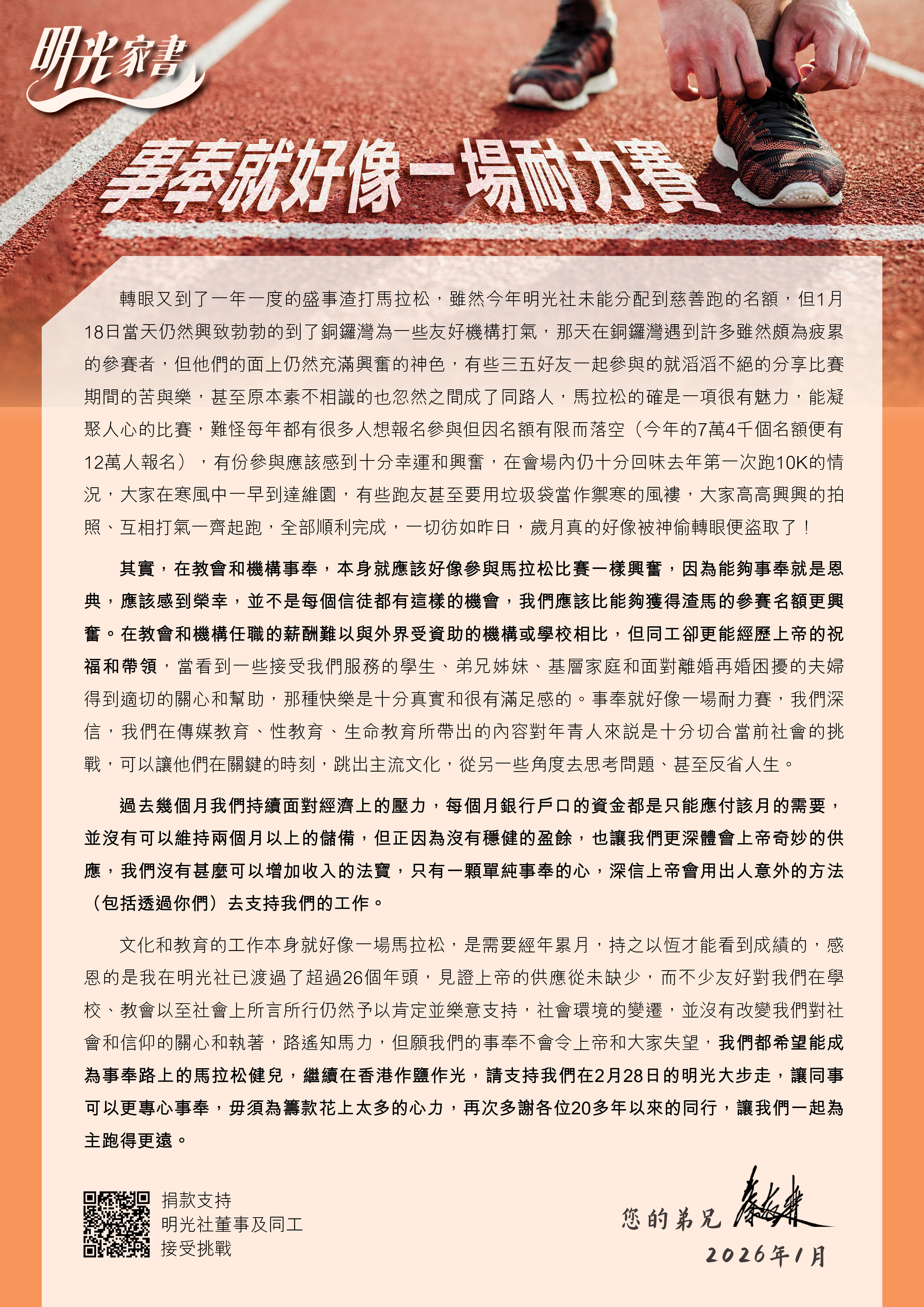 文化和教育的工作本身就好像一場馬拉松,是需要經年累月,持之以恆才能看到成績的,感恩的是我在明光社已渡過了超過26個年頭,見證上帝的供應從未缺少,而不少友好對我們在學校、教會以至社會上所言所行仍然予以肯定並樂意支持,社會環境的變遷,並沒有改變我們對社會和信仰的關心和執著,路遙知馬力,但願我們的事奉不會令上帝和大家失望,我們都希望能成為事奉路上的馬拉松健兒,繼續在香港作鹽作光,請支持我們在2月28日的明光大步走,讓同事可以更專心事奉,毋須為籌款花上太多的心力,再次多謝各位20多年以來的同行,讓我們一起為主跑得更遠。
