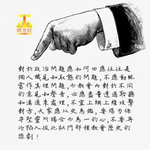近來認真計劃移民;重新領取BNO;想送子女出國讀書的人愈來愈多,他們用腳投下了是否繼續信任香港能維持以往的自由和人權的一票,借來的時間、借來的地方那種沒有根的感覺,又再次纏擾著不少香港人的心!土地回歸23年了,但人心的回歸卻愈來愈遠,法例和權力只能暫時壓下反對的聲音,無法真正贏取人心!另一個值得關注的現象是近日有報刊大篇幅報道教內一些有關政治的討論和爭議,內容針對一些在過往一年較多就反修例表達意見的牧者、個人和團體。對於政治問題應如何回應往往是個人識見和取態的問題,不應動輒當作真理問題,而教會內對於不同的意見和聲音,亦應盡量透過聆聽和溝通來處理,不宜上綱上線攻擊對方,大家應以史為鑑,要竭力保守聖靈所賜合而為一的心,不要再次陷入彼此批鬥那種教會歷史的悲劇!