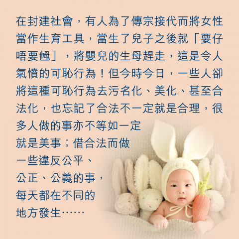 在封建社會,有人為了傳宗接代而將女性當作生育工具,當生了兒子之後就「要仔唔要乸」,將嬰兒的生母趕走,這是令人氣憤的可恥行為!但今時今日,一些人卻將這種可恥行為去污名化、美化、甚至合法化,也忘記了合法不一定就是合理,很多人做的事亦不等如一定就是美事;借合法而做一些違反公平、公正、公義的事,每天都在不同的地方發生;用美麗的言辭包裝損人利己的行為比比皆是。
