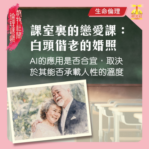 師生們擁有一雙敏銳的眼睛,察覺長者當年的遺憾,以長者渴望的夢想背景,生成令人滿足的婚照。這一切始於真誠的對話:學生聆聽長者活生生的愛情故事,那份用大半生守護的承諾,那份在回憶中流露的珍惜,讓人看見愛情的美好。為了這份感動,學生發自內心改造課室,用實際行動承載長者的期盼。這是一次美麗的協作——每個人發揮所長,互相補位:有時我們會被他人所需要,有時我們會成為別人的祝福。科技在此扮演了關鍵角色,將長者遙遠的想像化為真實的婚紗照片,甚至令本不相識的人們,因這份心意而有生命的交流。這個故事帶來更深的思考:AI的應用是否合宜,其中一個關鍵在於能否承載人性的溫度。當科技應用在「對自己有益、對別人有益、對社會有益」的目標,展現人性的美善而非取代真實情感,這才是科技進步所帶來的動人之處。