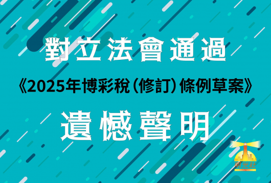 本年的財政預算案公佈,政府邀請賽馬會提交建議,以有效打擊非法賭博活動為由,積極探討規範籃球博彩活動。言下之意,政府有意以籃球博彩合法化來打擊外圍賭博,為減赤而不擇手段。本社堅決反對政府以打擊非法賭博活動為名而罔顧對市民、青少年價值觀的長遠影響,帶頭鼓勵市民參與籃球賭博。籃球賭博合法化只會令社會長遠投放更加多資源及成本,百害而無一利。