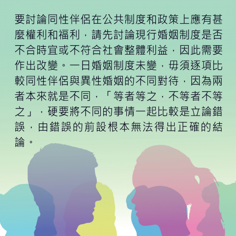 今次有關報告列出21項法律範疇中性小眾面對的差別待遇,正正反映了我們當初的憂慮,就是一旦承認同性伴侶應該享有某些本來只屬於異性婚姻才可以享有的權利或福利,就會產生骨牌效應,同志團體便會一步一步地以受到差別對待/歧視為理由而爭取與異性婚姻在所有不同的範疇都有同等的待遇。因此,我們重申,現行香港的婚姻制度只是承認一男一女、一夫一妻的婚姻,任何其他形式的組合都不是法律上認同的婚姻,不應享有猶如婚姻的權利和福利,要討論同性伴侶在公共制度和政策上應有甚麼權利和福利,請先討論現行婚姻制度是否不合時宜或不符合社會整體利益,因此需要作出改變。一日婚姻制度未變,毋須逐項比較同性伴侶與異性婚姻的不同對待,因為兩者本來就是不同,「等者等之,不等者不等之」,硬要將不同的事情一起比較是立論錯誤,由錯誤的前設根本無法得出正確的結論。